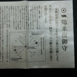 この一陽来復は、冬が終わり、春が訪れること、また、不遇の時が続いた後、幸福に向かってゆくことを意味します。また、この御守は金銀融通の御守として古来の吉例により、冬至、大晦日、節分のいずれかの日の夜中の12時にその年時に決められた方位にある壁や柱の高いところに貼ります。(今回は東側)